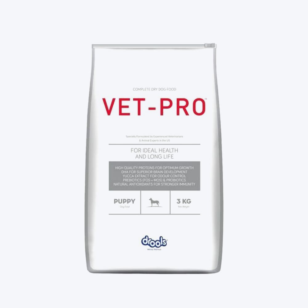Drools Vet-Pro Puppy is 100% complete and balanced formula enriched with DHA, natural antioxidants, prebiotics and probiotics. It is formulated to meet the nutritional levels established by AAFCO Dog Food Nutrient Profiles for the growing puppy.